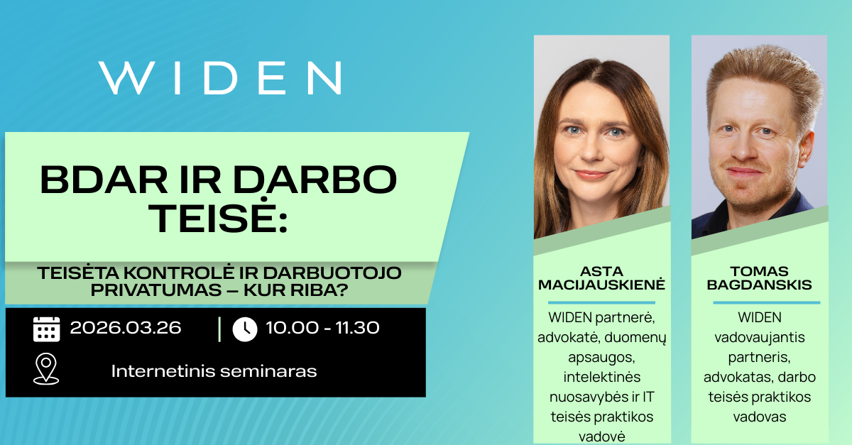 Kovo 26 d. 10.00 – 11.30 val. maloniai kviečiame dalyvauti advokatų kontoros WIDEN organizuojamame internetiniame seminare „BDAR ir darbo teisė: teisėta kontrolė ir darbuotojo privatumas – kur riba?“